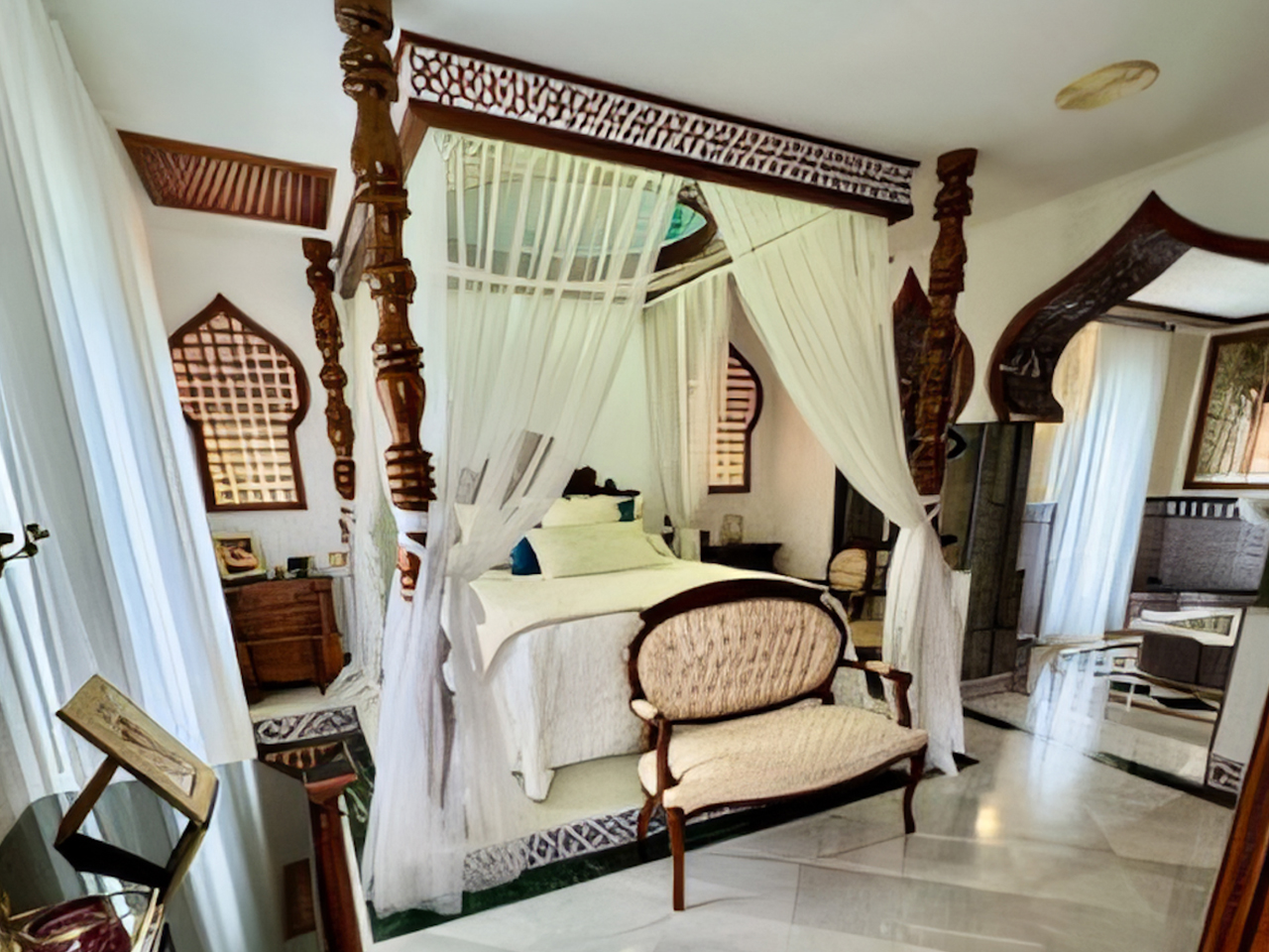 La Villa Árabe es un oasis de lujo inspirado en las Mil y Una Noches, situada junto al Paraje Natural de Punta Entinas-Sabinar y a tan solo 10 minutos de la playa. Su imponente cúpula azul es el centro visual de la villa, evocando la grandeza y la magia de los antiguos palacios árabes. Los interiores son igualmente impactantes, decorados con frescos originales del renombrado artista Waldi Wrobel, celosías iluminadas, y fuentes árabes interiores que añaden serenidad y elegancia a los espacios. Los suelos de mármol, arcos de madera tallada, azulejos andalusí y nazari, y carpintería de pino tea crean una atmósfera de lujo y exotismo. El dormitorio principal, con una cama de dosel y baño en suite, se abre a una gran terraza con vistas al jardín.